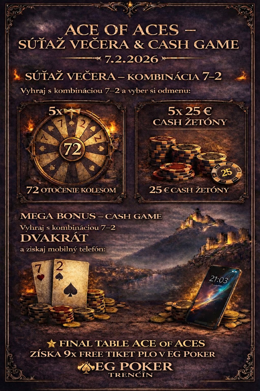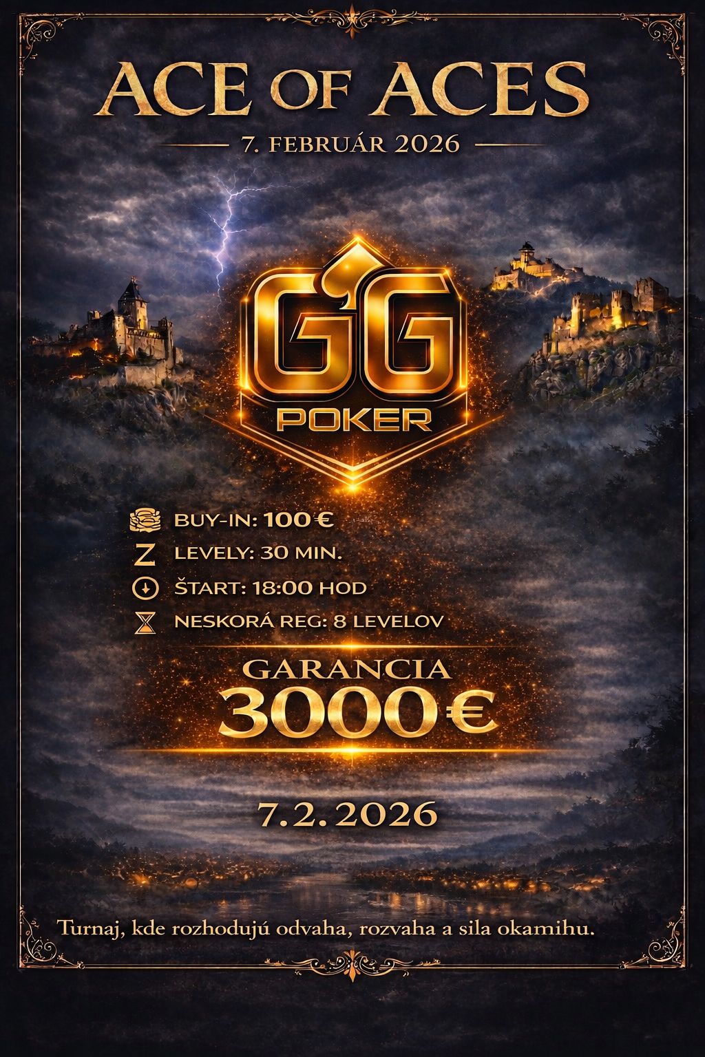 Pokerová komunita sa v sobotu 7. februára 2026 dočká eventu, ktorý spája turnajovú kvalitu, doplnkové promo akcie a prepojenie medzi dvoma aktívnymi pokerovými centrami. Turnaj Ace of Aces v herni GG Poker Nové Mesto nad Váhom vzniká v spolupráci s EG Poker Trenčín a je postavený ako večer, kde sa stretáva klasický NLH formát s bonusovou motiváciou pre cash game hráčov aj turnajových finalistov.