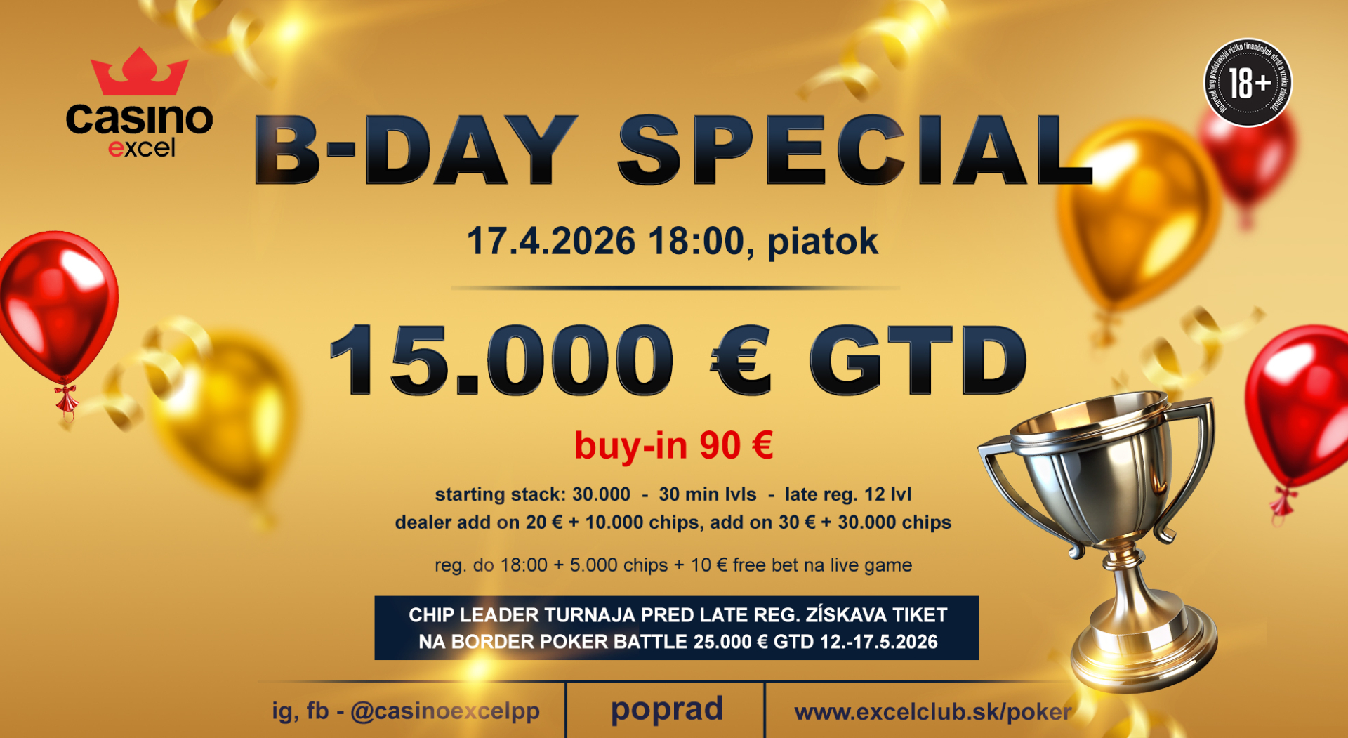 Casino Excel Poprad pripravilo pre hráčov špeciálny narodeninový turnaj B-DAY SPECIAL, ktorý sa odohrá v piatok 17. apríla 2026 o 18:00. Pri buy-ine 90 € čaká na účastníkov atraktívna garancia 15.000 €, bohatá štruktúra a viacero bonusov vrátane free betu či extra chipov.