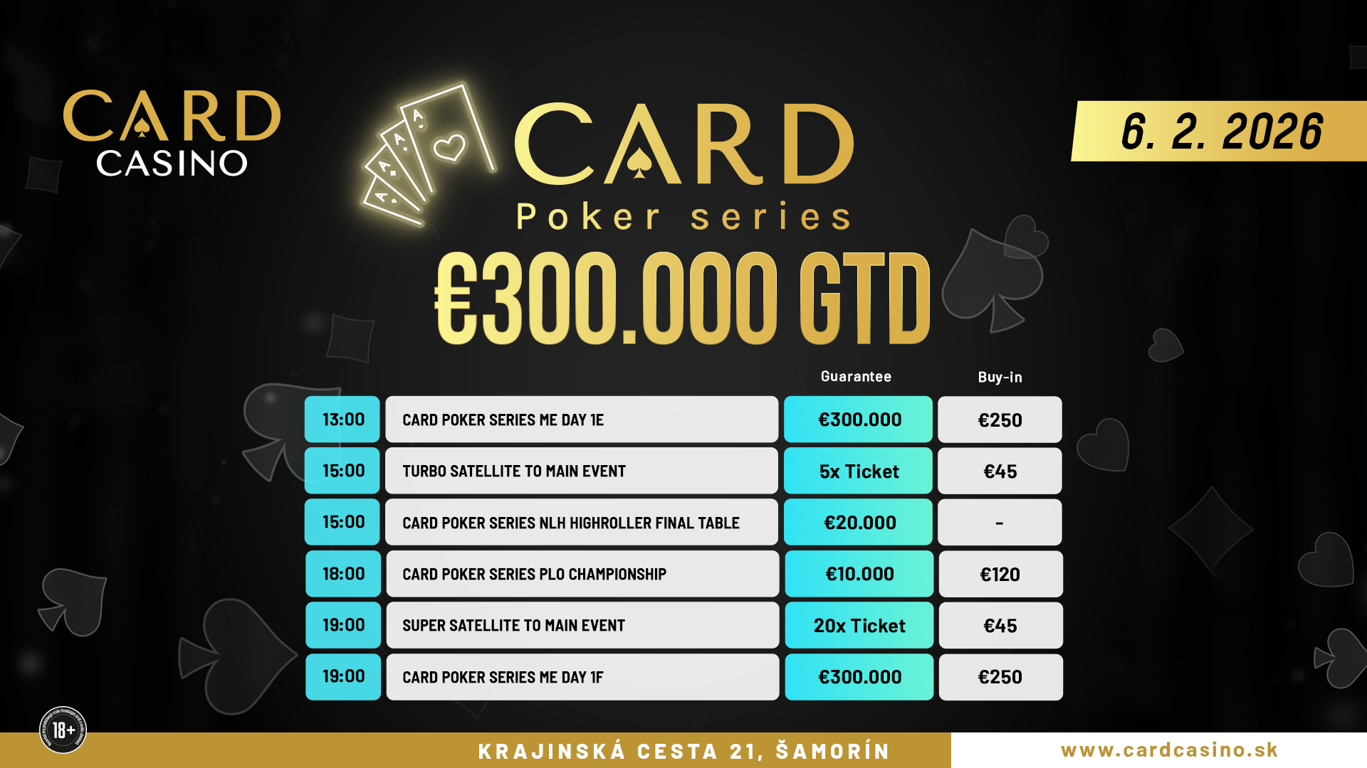 €300 000 garantovaný Main Event festivalu CARD Poker Series v Card Casino Šamorín vstúpil do svojej hlavnej fázy po odohraní prvých štyroch štartovacích flightov. Day 1A, 1B, 1C a 1D Turbo priniesli spolu stovky entries a vytvorili silné medzinárodné pole pre pokračovanie turnaja.