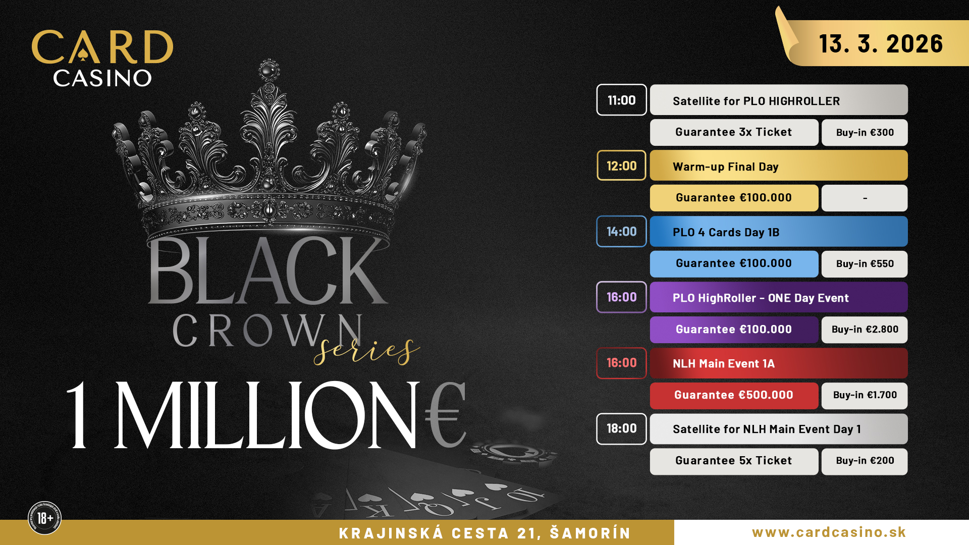 Program dopĺňajú aj turnaje v Pot Limit Omaha. Špeciálny PLO 4 Cards event má taktiež garantovaný prizepool 100.000 € a patrí medzi najobľúbenejšie side eventy festivalu. Card Casino Šamorín sa v posledných rokoch stalo jednou z najvýznamnejších pokerových destinácií v regióne. Moderný poker room, kvalitná organizácia a skúsený turnajový tím umožňujú pravidelne organizovať veľké medzinárodné série. Do Šamorína tak pravidelne prichádzajú hráči zo Slovenska, Česka, Poľska, Maďarska, Rakúska či Izraela. Vďaka tomu majú turnaje v Card Casino často silnú medzinárodnú účasť a veľmi atraktívne prizepooly. Aj počas festivalu Black Crown Series sa očakáva, že víkendové flighty prilákajú najväčší počet hráčov. Práve tie totiž bývajú tradične najväčšie a často rozhodujú o tom, či sa garancia výrazne prekoná.