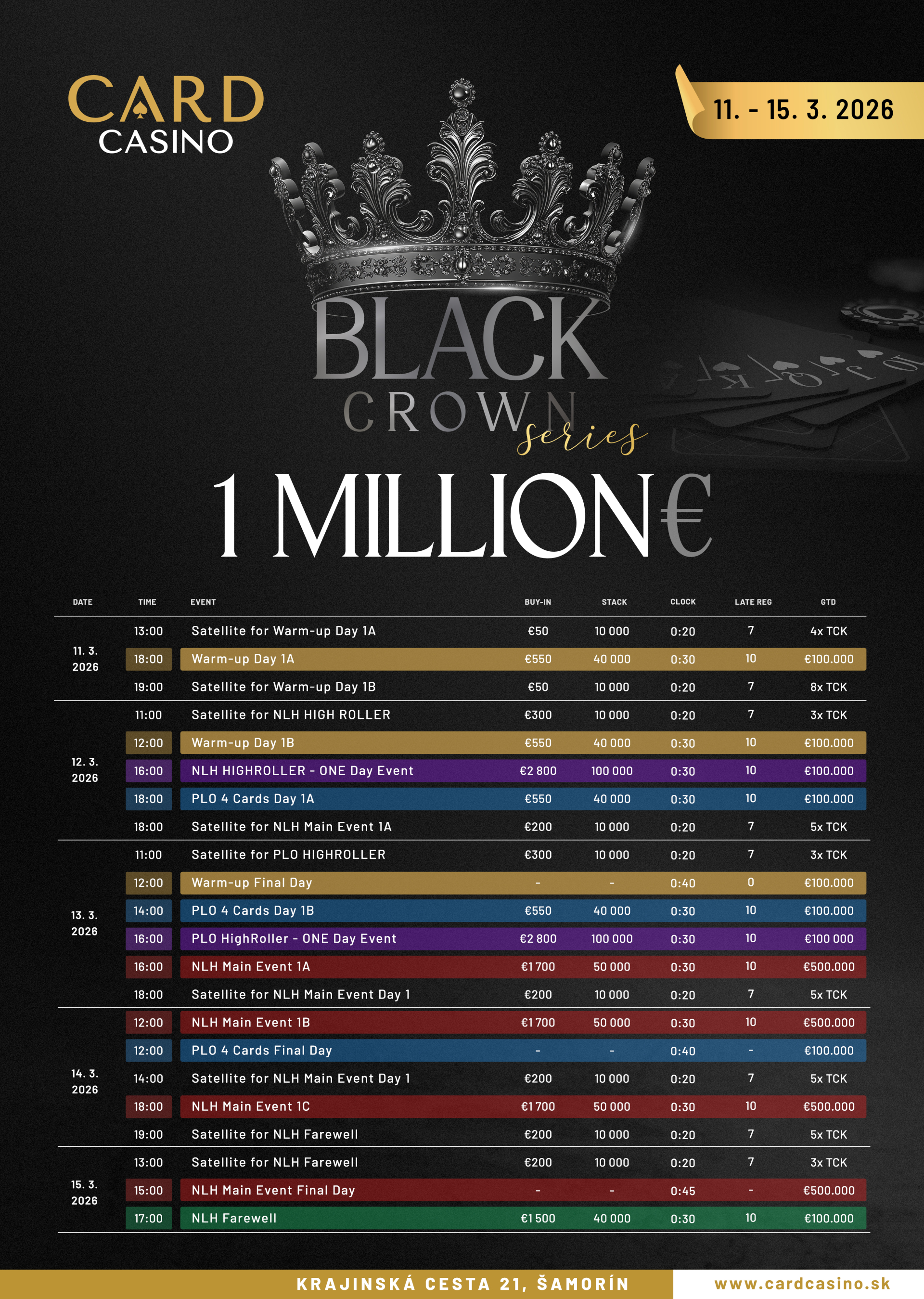 Pokerový festival Black Crown Series v Card Casino Šamorín sa dostáva do svojej najdôležitejšej fázy. Po úvodných dňoch plných side eventov a highroller turnajov prichádza dnes na rad hlavný bod programu – NLH Main Event s buy-inom 1.700 € a garantovaným prizepoolom 500.000 €. Práve tento turnaj predstavuje vrchol celej série, ktorá sa v Šamoríne koná od 11. do 15. marca a ponúka hráčom celkovú garanciu až 1 milión eur.