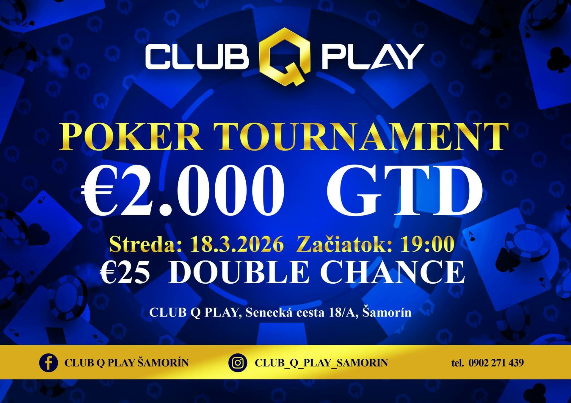 Club Q Play v Šamoríne pripravuje na stredu 18. marca 2026 ďalší atraktívny turnaj pre široké spektrum hráčov. Na programe je €25 Double Chance event s garanciou €2.000, ktorý kombinuje dostupný buy-in s variabilnou štruktúrou a možnosťami pre agresívnejší aj konzervatívnejší herný štýl.