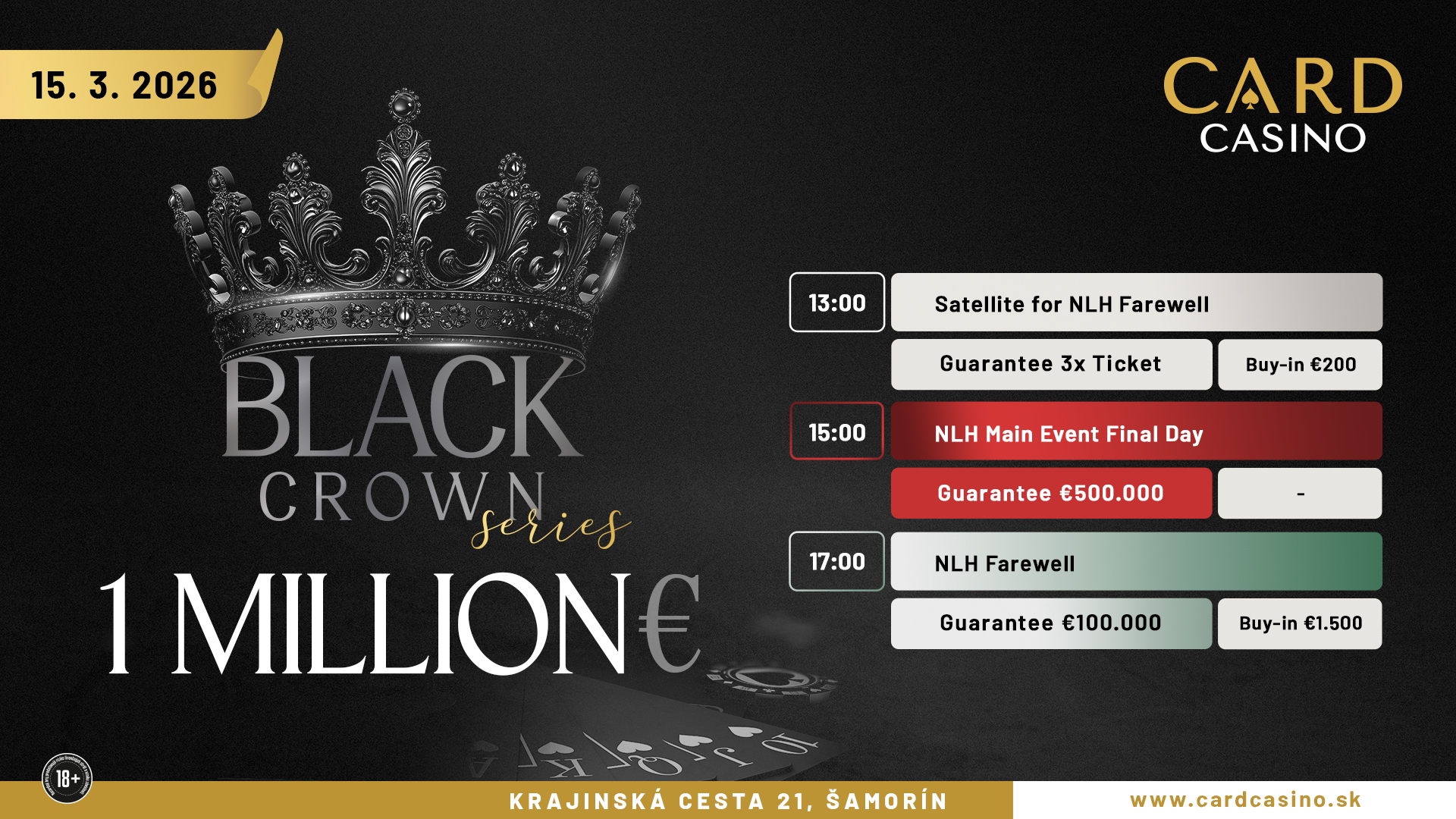 Pokerový festival Black Crown Series v Card Casino Šamorín sa dostáva do svojej rozhodujúcej fázy. Po piatkovom úvodnom štartovacom dni Main Eventu dnes prichádzajú na rad posledné dva flighty turnaja s garantovaným prize poolom 500.000 €. Day 1B odštartuje o 12:00 a večerný Day 1C je naplánovaný na 18:00. Práve tieto dva flighty definitívne určia veľkosť fielda a zároveň naznačia, aká veľká suma bude musieť byť do prize poolu doplatená.
