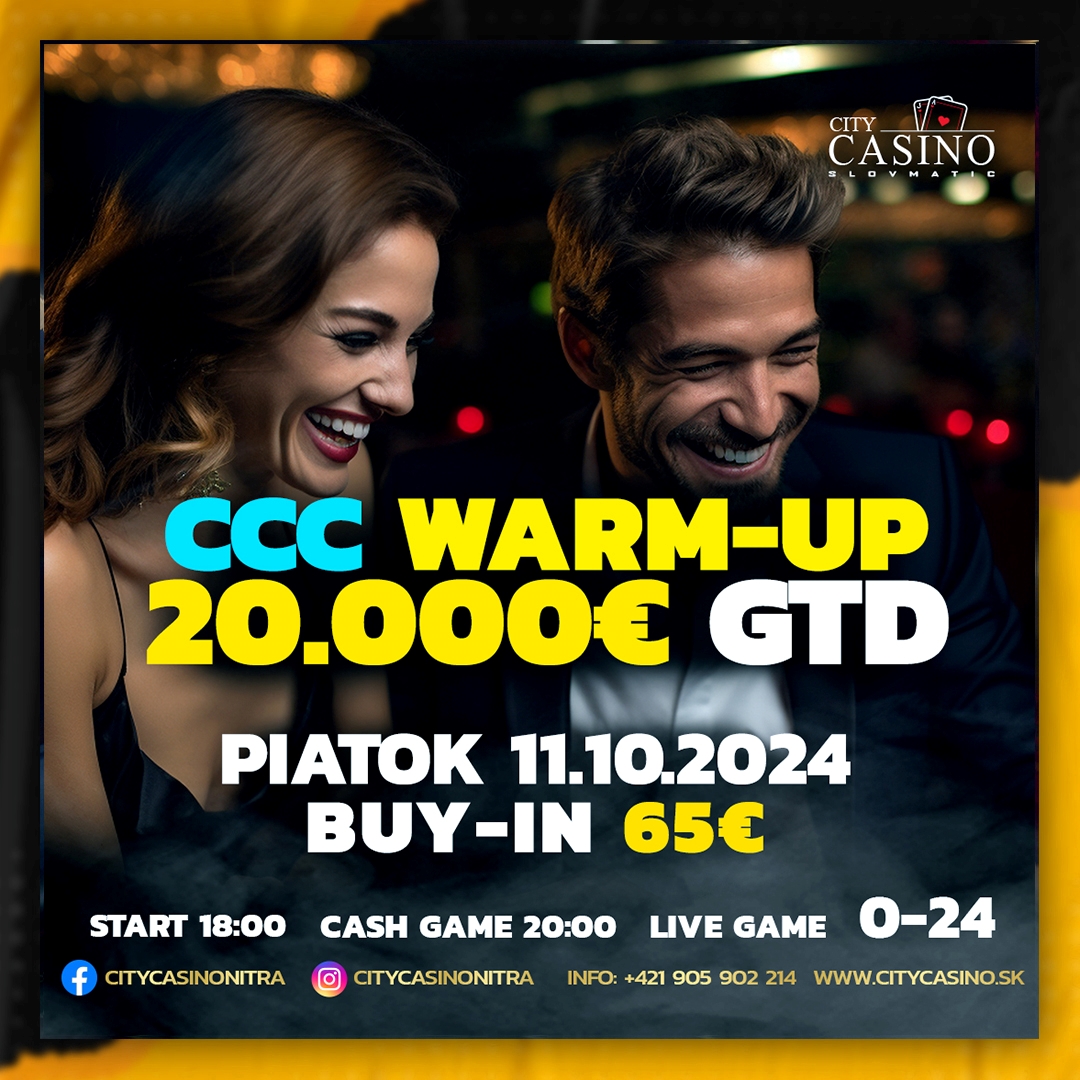 Doterajší turnajový vrchol čoraz oblúbenejšieho City Casino Nitra by si rozhodne nemal nechať ujsť žiaden pokrový priaznivec zo širokého okolia. Naladiť sa na túto akciu budete môcť už tento piatok 11.10., kedy je na programe CCC Warm-Up s garanciou €20.000 pri vklade €65. Súčasťou turnaja je 4x75€ Tiket do City Casino Championship.