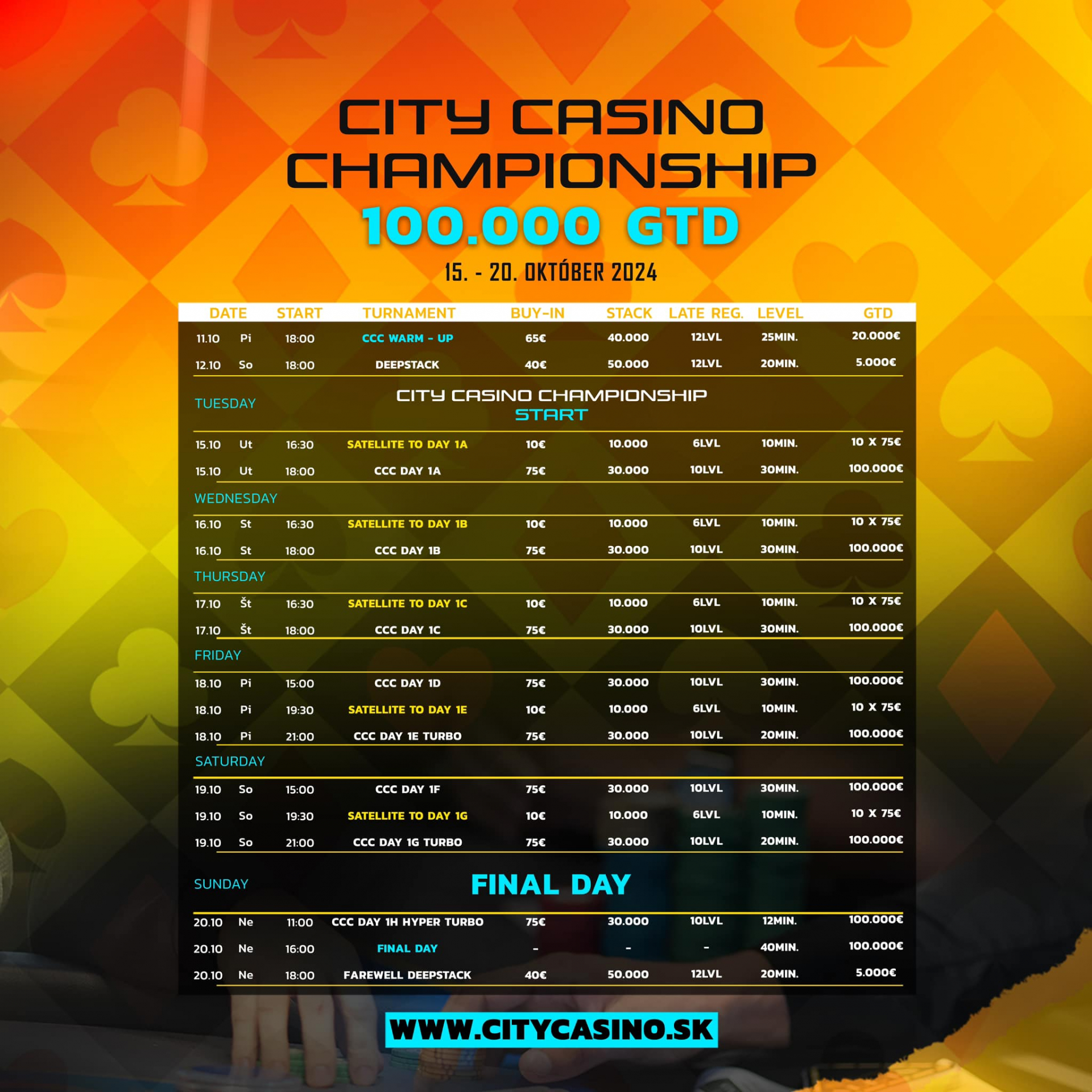 Samotný City Casino Championship so 100-tisícovou garanciou potom oficiálne odštartuje v utorok 15.10.. Na programe bude celkom osem flightov a celý turnaj vyvrcholí v nedeľu 20.10. veľkým finále. Štartový stack bude nastavený na 30.000 žetónov, v štandardných flightoch budú levely 30-minútové, v turbo dni 20-minútové a v hyper turbo flighte 12-minútové. Finále odštartuje v nedelu od 16:00 a blind levely budú 40-minútové.
