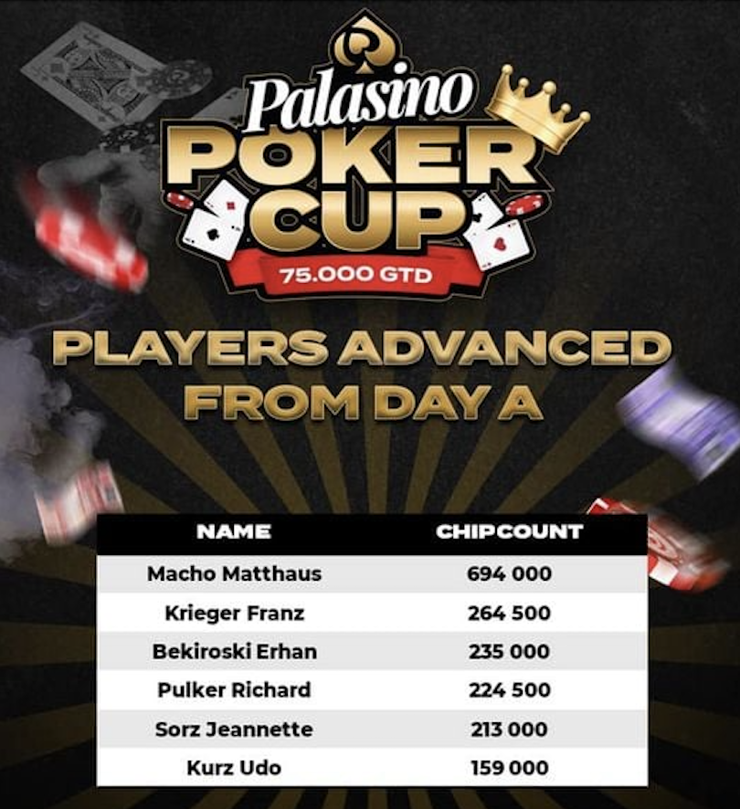 Hráči majú v Palasino Poker Cup k dispozícii štartový stack v hodnote 30.000 žetónov. Blindy sa menia po 25 minútach a neskorá registrácia je možná do konca 10 levelu, pričom po túto dobu budú mať hráči k dispozícii aj možnosť neobmedzeného re-entry. Z každého štartovného dňa postúpuje 10% hráčov do FINAL DAY, ktorý sa rozohrá v nedeľu 05.05. od 17.00 h. Všetci hráči v nedeľnom finále už budú na platených miestach. Víťaz turnaja si okrem finančnej odmeny odnesie aj krásnu trofej.