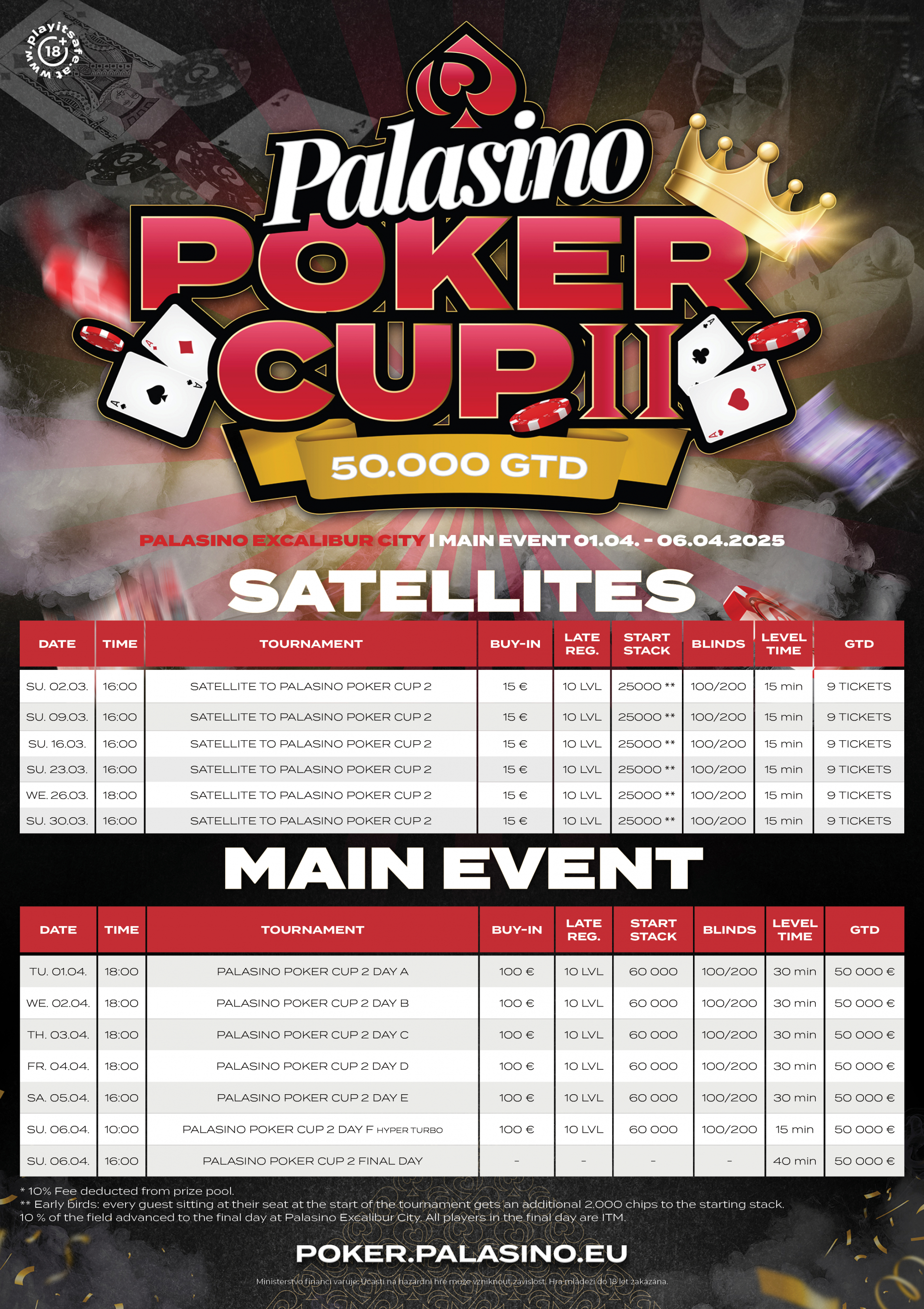Každú stredu môžete naskočiť do 1.200 € GTD NLH turnaja už za 20 €, zatiaľ čo štvrtky patria 2.500 € GTD turnaju s buy-inom 25 €. Piatkové turnaje potom prinášajú mix NLH a PLO formátov s garanciami až 6.000 €. Nedele budú patriť kvalifikáciam o 9 garantovaných tiketov do Palasino Poker Cup 2, ktorý sa bude konať začiatkom apríla a ponúkne prize pool v hodnote 50.000 € za buy-in iba 100 €. Viac informácií o tomto turnaji vám prinesieme v najbližších dňoch.