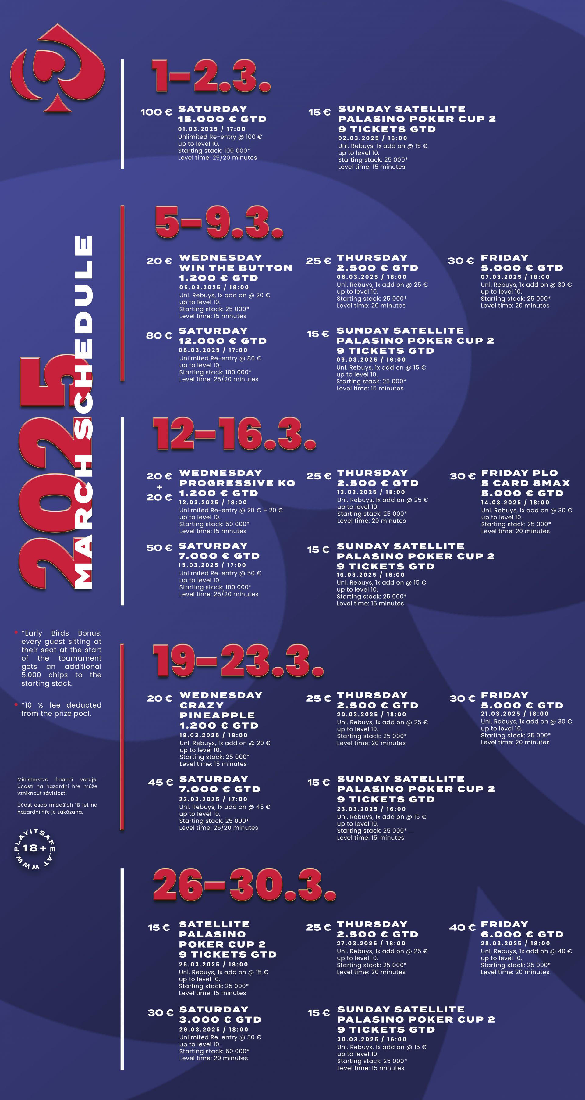 Aj v marci je k dispozícii Early Bird Bonus pre všetkých! Každý hráč, ktorý je včas pri stole na začiatku turnaja, získa 5.000 žetónov navyše k svojmu štarting stacku. Každý chip sa počíta a môže rozhodnúť o víťazstve!