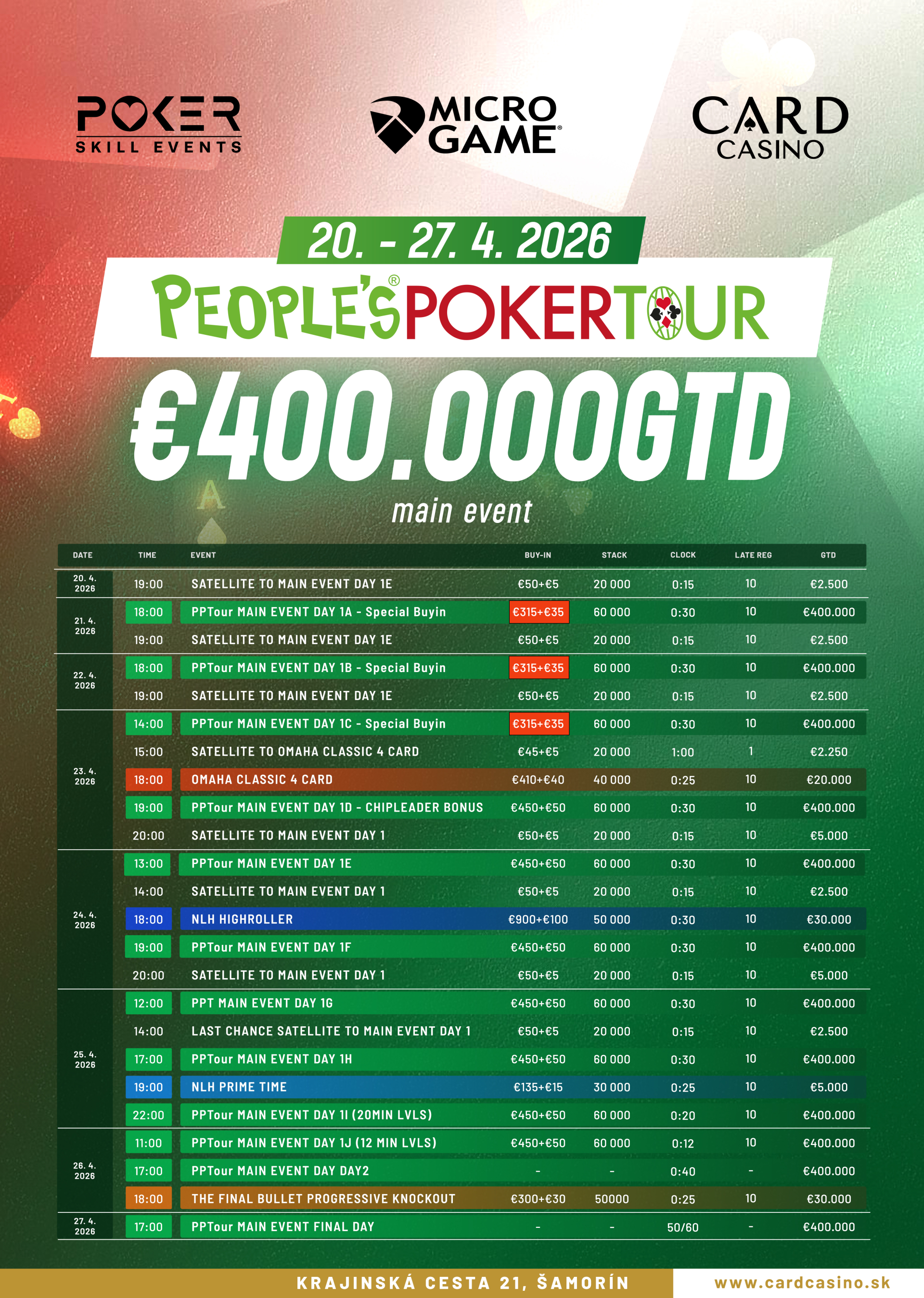 22:00 – PPTOUR MAIN EVENT DAY 1I (20 min. lvls): Záverečná „turbo“ šanca. Krátke levely a vysoké tempo – ideálna príležitosť pre tých, ktorí radi hrajú pod tlakom.