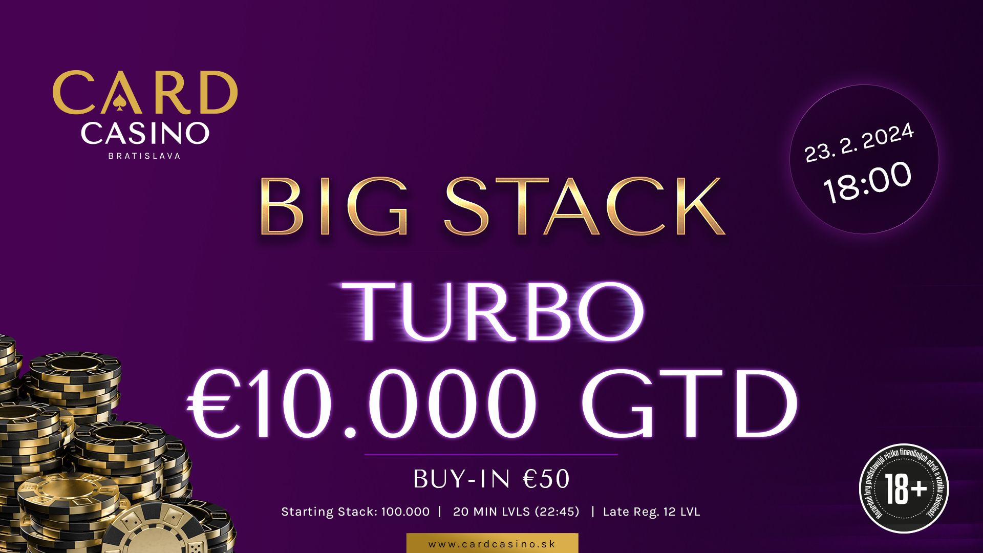 V piatok 23. februára štartuje rovnako o 18:00 Big Stack Turbo s peknou garanciou 10.000€ a pohodovým buy-inom 50€. Na hráčov bude čakať stack 100 000 žetónov, level za levelom sa budú striedať po 20 minútach.