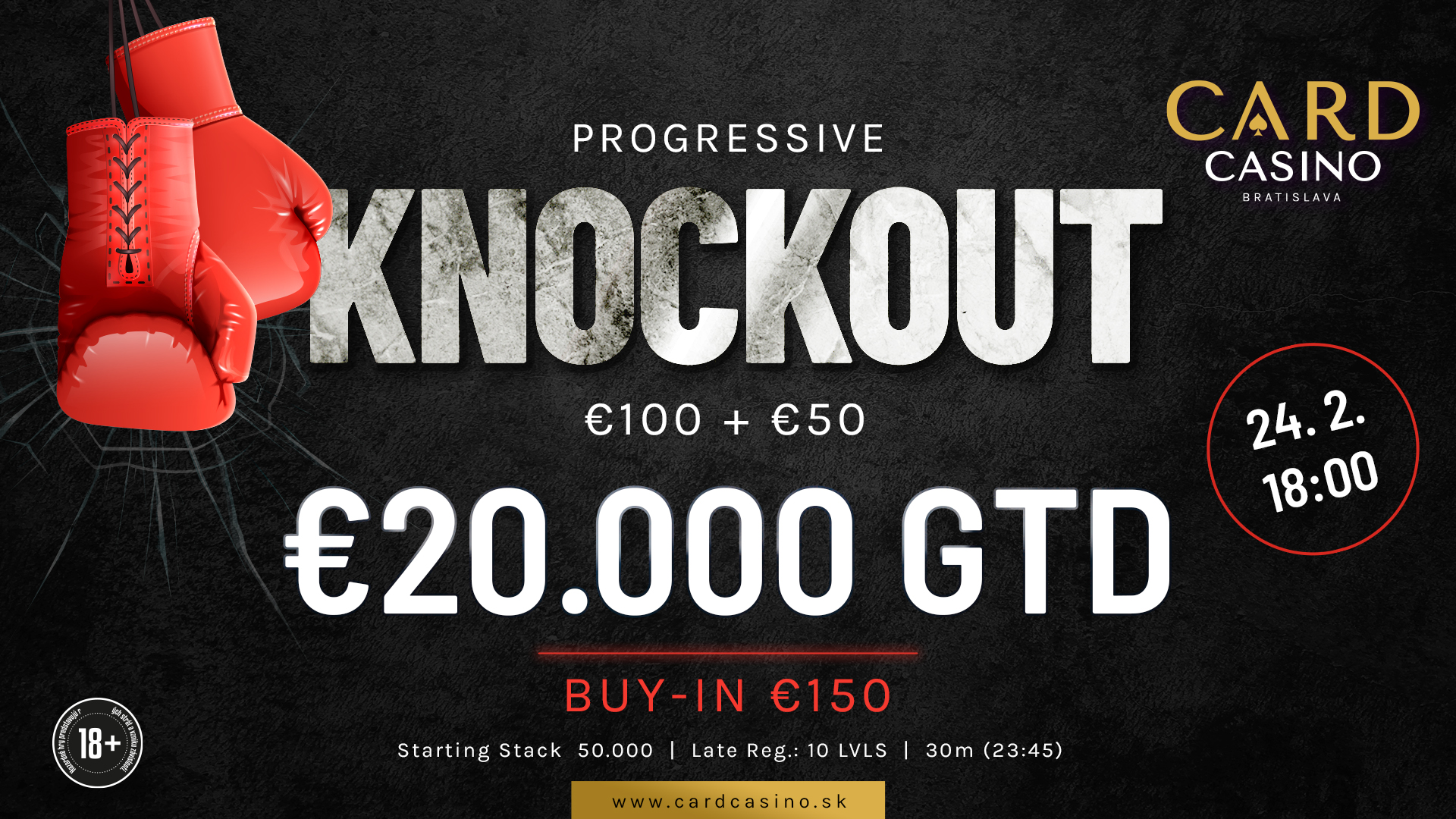 V sobotu sa môžu hráči tešiť na atraktívny turnaj PKO 100€+50€, teda Progressive KO-čkový turnaj. Jeho garancia je krásnych 20.000€. Štart turnaja je naplánovaný na 18:00, pohodu dodajú hráčom 30-minútové levely a počiatočný stack o výške 50 000 žetónov.