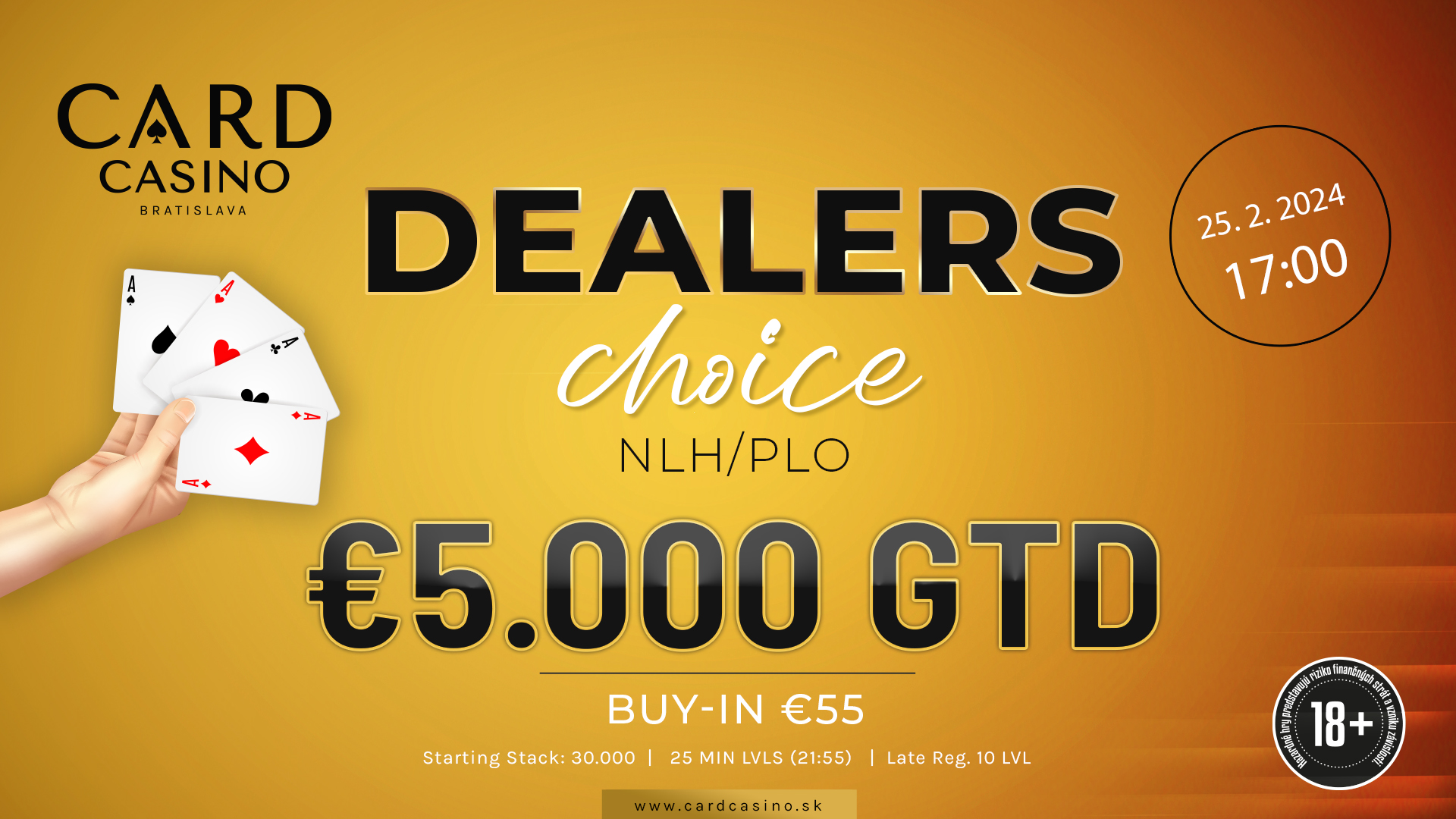 Na záver týždňa, v nedeľu, sa môžu prítomní tešiť na turnaj Dealers Choice NLH/PLO. Buy-in je 55€, garancia je 5.000€. Turnaj štartuje už od 17:00.