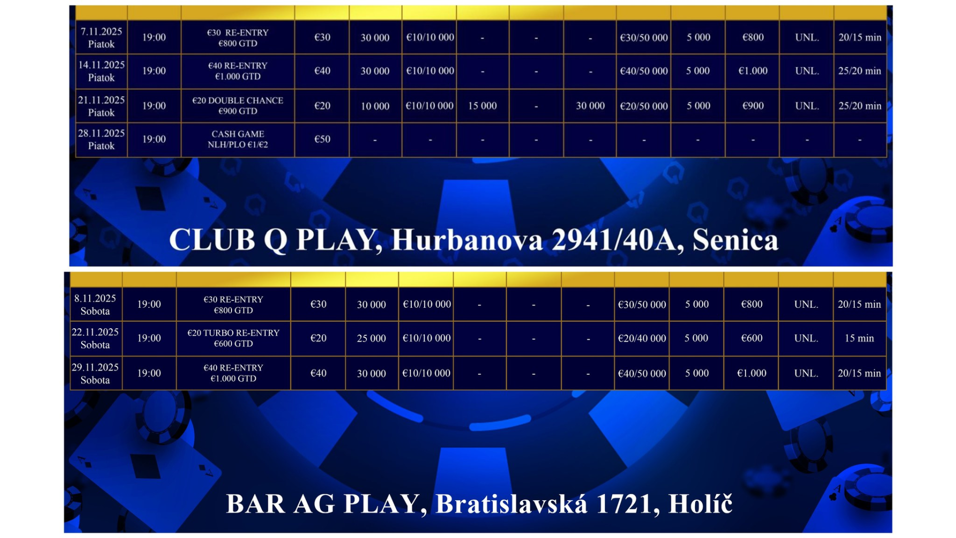 Šamorín nie je jediné mesto, kde značka Q Play organizuje pokerové turnaje. Fanúšikovia môžu zavítať aj do Club Q Play Senica, kde sa v novembri hrá séria piatkových turnajov s buy-inom od €20 do €40 a garanciami až do €1 000 GTD. Pre hráčov zo Záhoria je to skvelá možnosť zahráť si každý týždeň v modernej herni s pohodovou atmosférou.