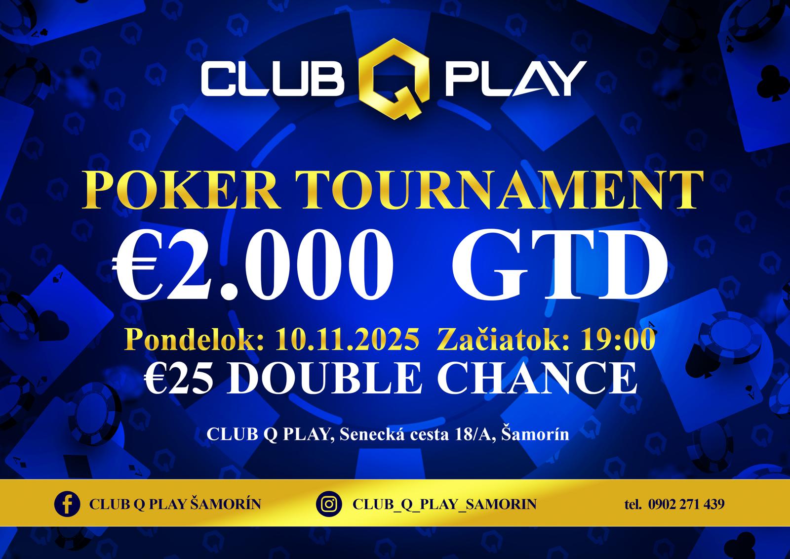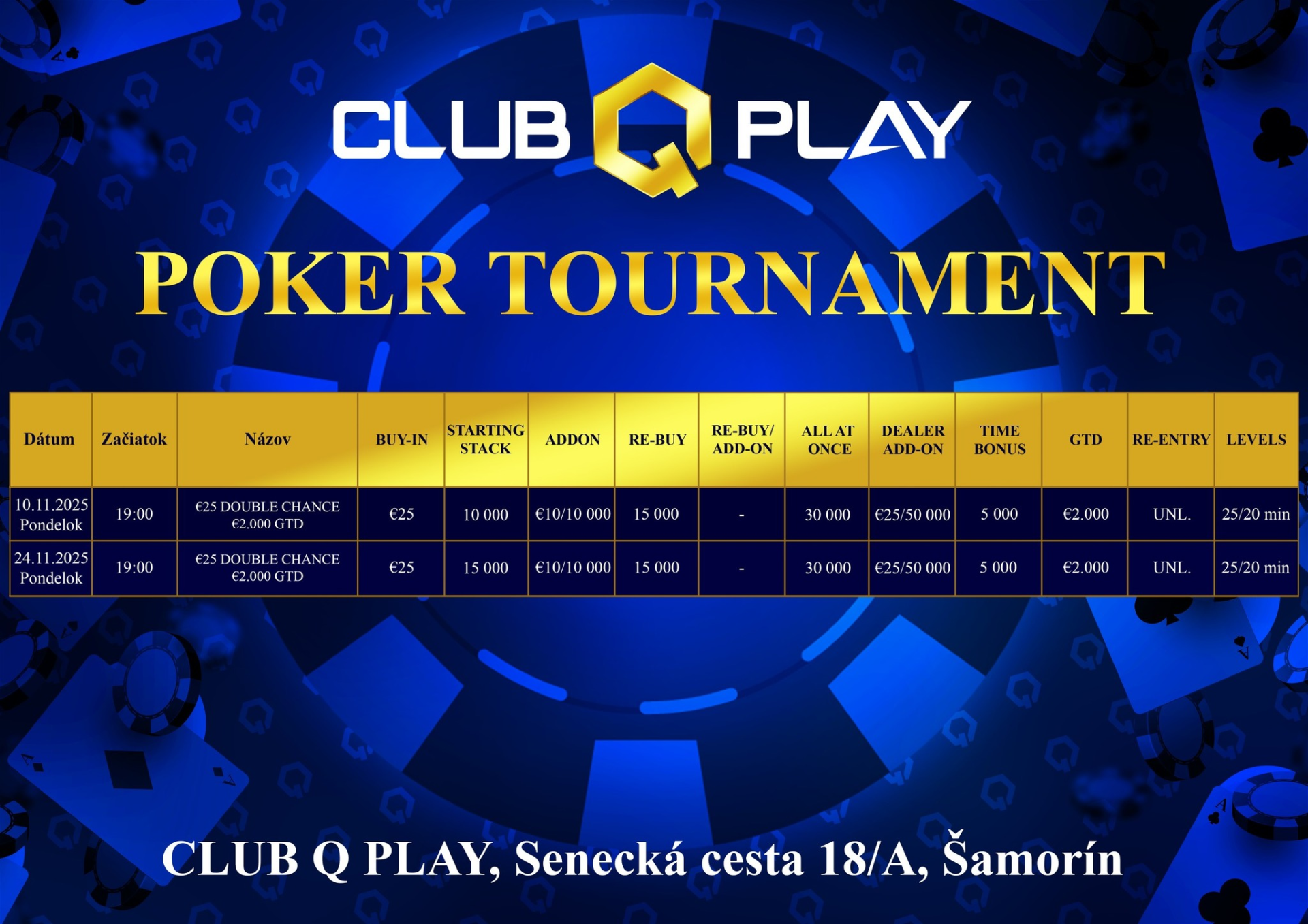 V okolí Bratislavy sa tento mesiac hrá nielen veľký poker vo veľkých kasínach, ale aj komornejšie klubové eventy s výbornou atmosférou. Jedným z nich je €25 Double Chance €2 000 GTD, ktorý sa uskutoční v pondelok 10. novembra 2025 od 19:00 v Club Q Play Šamorín. Turnaj ponúka priaznivý pomer nízkeho buy-inu a zaujímavej garancie, čo z neho robí ideálnu voľbu pre lokálnych hráčov aj rekreačných pokristov z okolia hlavného mesta.