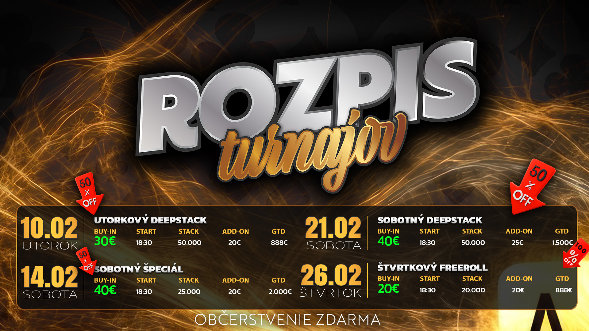 Buy-in do turnaja je nastavený na 40 € s možnosťou re-entry. Organizátori však pripravili aj atraktívny bonus pre disciplinovaných hráčov – do začiatku turnaja, teda do 18:30 hod., platí 50 % zľava z buy-inu. To znamená, že hráči môžu vstúpiť do hry za zvýhodnených podmienok a zároveň bojovať o garantovaný prize pool 1.500 €.