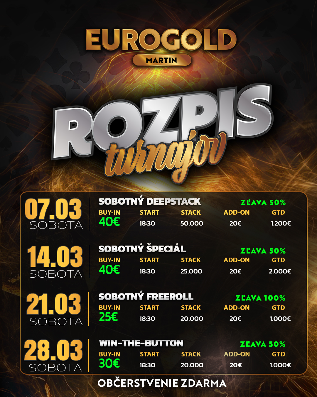 Pokerová scéna na severe Slovenska pokračuje v stabilnom tempe a jedným z pravidelných bodov na turnajovej mape je aj Eurogold Game Club & Poker Martin. V sobotu 13. marca 2026 sa v priestoroch obchodného centra Turiec uskutoční ďalšie vydanie obľúbeného turnaja Sobotný Špeciál, ktorý ponúkne hráčom garantovaný prize pool vo výške 2.000 €. Event je dlhodobo súčasťou klubového kalendára a vďaka dostupnému buy-inu, férovej štruktúre a príjemnému prostrediu pravidelne priťahuje hráčov z Martina, Žiliny aj širšieho regiónu Turca.