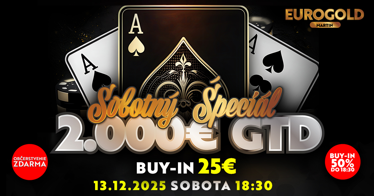 Pokrový víkend v Martine bude patriť tradičnému turnaju Sobotný Špeciál, ktorý sa uskutoční v Eurogold Game Club & Poker Martin už v sobotu 13. decembra 2025. Organizátori opäť lákajú hráčov na atraktívnu garanciu €2.000, dostupný buy-in a zvýhodnené podmienky pre skorých účastníkov. Ide o pravidelný pokerový turnaj, ktorý si za posledné obdobie vybudoval stabilnú hráčsku základňu a patrí medzi najnavštevovanejšie eventy v regióne Turca.