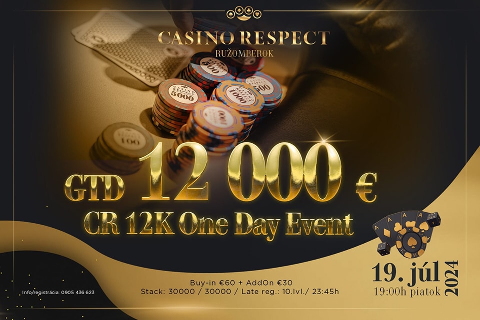 O zaujímavú pokrovú akciu nie je v ružomberskom Casine Respect núdza ani toto leto. Už tento piatok sa hráči môžu tešiť na najväčší júlový turnaj, ktorým bude jednodňový CR 12K One Day Event s fantastickou garanciou €12.000 pri vklade €60.