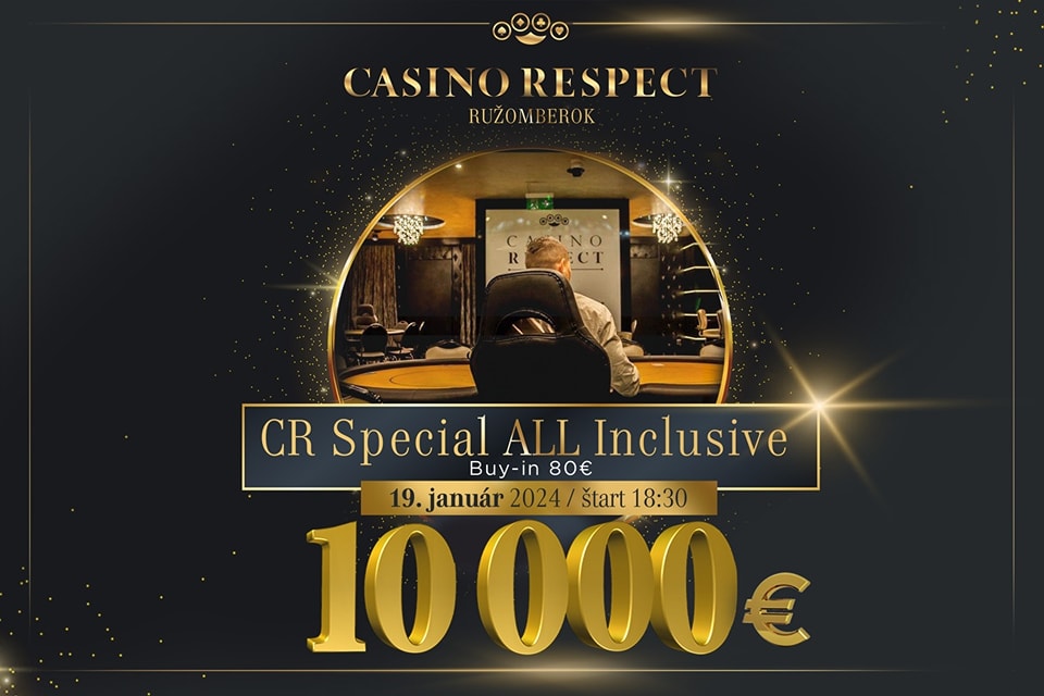 Populárny CR Special turnaj nebude v ružomberskom Casine Respect chýbať ani tento piatok, pričom hráči sa tentokrát môžu tešiť na zvýšenú garanciu. V CR Special All-Inclusive sa bude od 18:30 bojovať o podiely z minimálne €10.000 pri vklade €80. Vstup si budete môcť výrazne zlacniť vo štvrtkovej kvalifikácii s vkladom €10, v ktorej sú garantované 3 vstupenky.