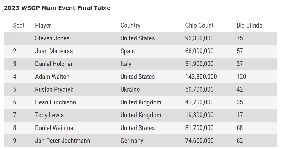 Main Event World Series Of Poker ide do svojho finále! Po zatiaľ najkratšom dni tohtoročného svetového šampionátu poznáme menoslov finálovej deviatky. Blízko k titulu majstra sveta sú traja Američania, dvaja Briti, Nemec, Španiel, Ukrajinec a napokon jeden taliansky zástupca.