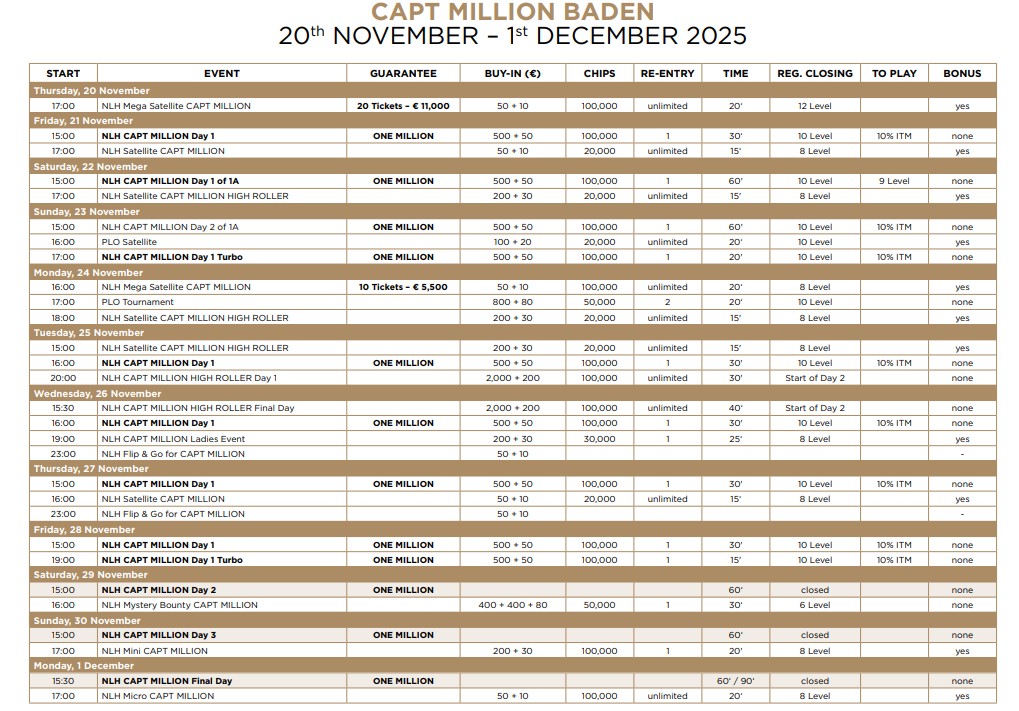 Casino Baden sa v týchto dňoch stalo centrom pozornosti európskej pokrovej komunity. Prebieha tu jedno z najvýznamnejších podujatí v kalendári Casinos Austria – séria CAPT Million, ktorej vrcholom je Main Event s garantovanou sumou €1.000.000. Turnaj odštartoval 20. novembra a vyvrcholí 1. decembra, pričom už prvé dni priniesli mimoriadne silné čísla aj výrazný záujem hráčov z rôznych krajín.